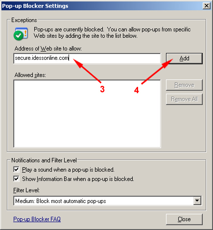Step 3: Type the web site's url address. Step 4: Click 'Add' button then click close to close the window. Note: You can also turn off the Pop-up blocker by clicking the 'Turn Off Pop-up Blocker' under Pop-up Blocker Menu. |
