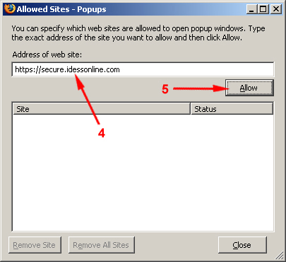 Step 4: Type the web site's url address. Step 5: Click allow button. |
