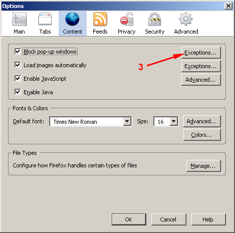 | Step 3: If block pop-up windows checkbox is checked, click 'Exceptions...' button. |